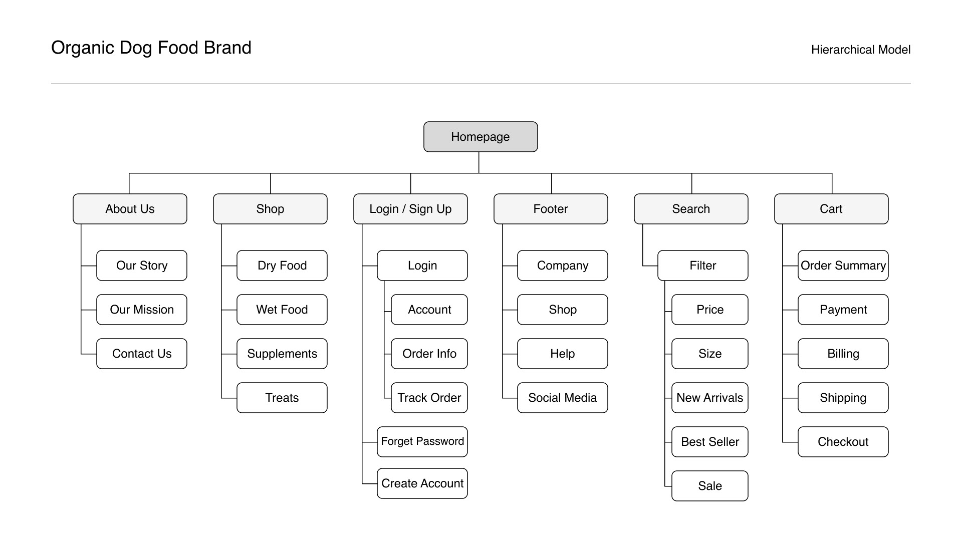 Difficulty with website navigation was a primary pain point for users, so I used that knowledge to create a sitemap. My goal here was to make strategic information architecture decisions that would improve overall website navigation. The structure I chose was designed to make things simple and easy.